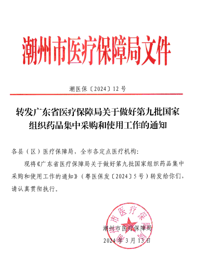 【潮州】潮医保〔2024〕12号 转发广东省医疗保障局关于做好第九批国家组织药品集中采购和使用工作的通知