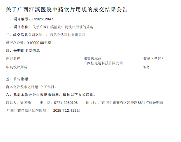 【广西壮族自治区江滨医院】关于广西江滨医院中药饮片用袋的询比采购结果成交公告