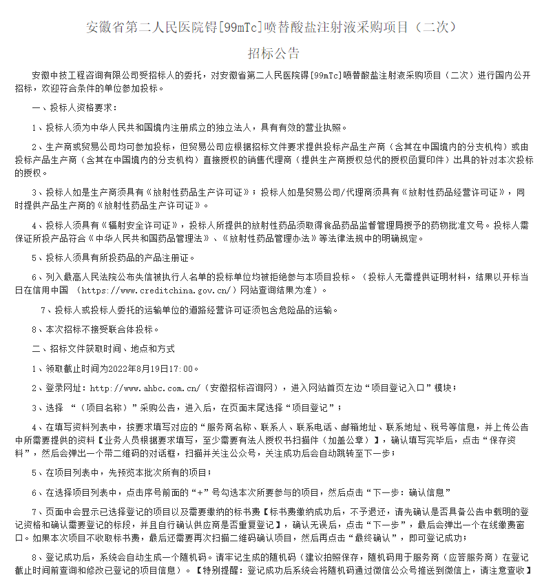 【安徽省第二人民医院】安徽省第二人民医院锝〔99mTc〕喷替酸盐注射液采购项目(二次)招标公告