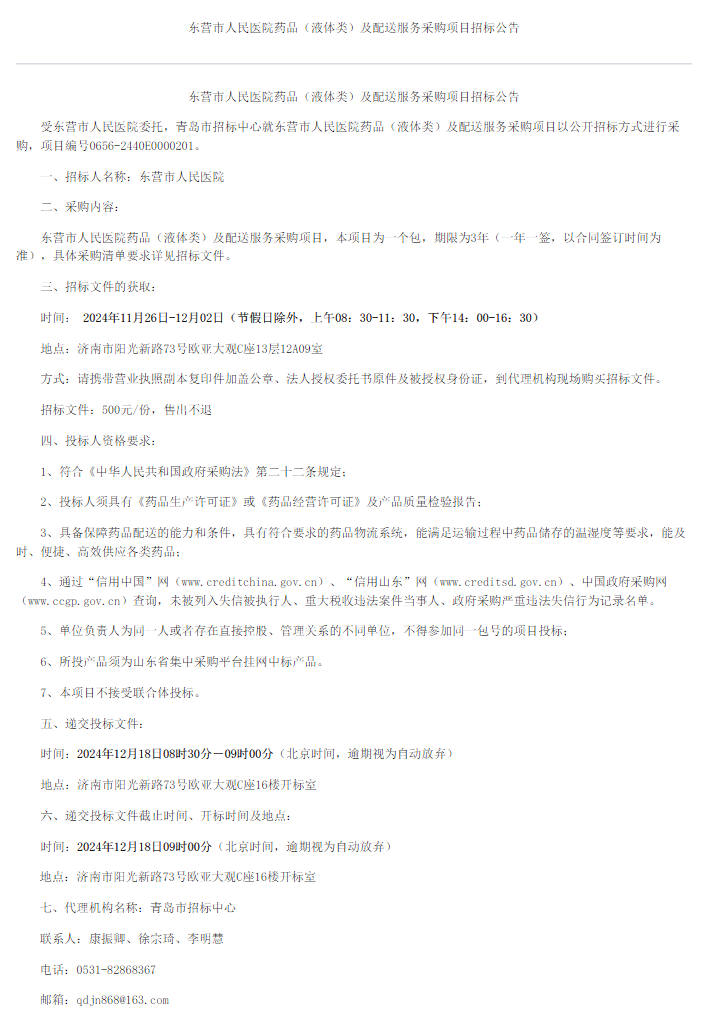 【东营市人民医院】山东省东营市人民医院药品(液体类)及配送服务采购项目招标公告(20241125)