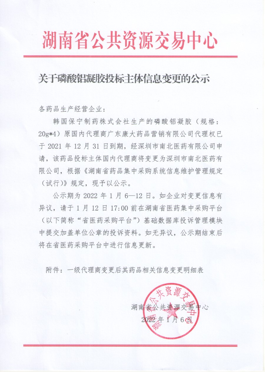 【湖南】湖南省关于磷酸铝凝胶投标主体信息变更的公示