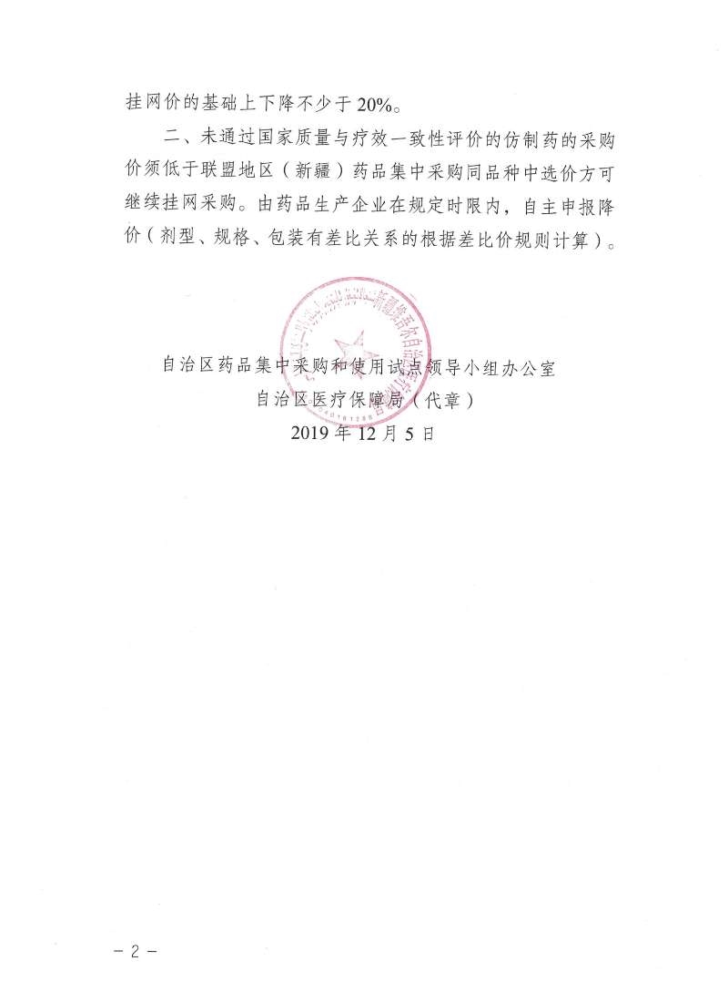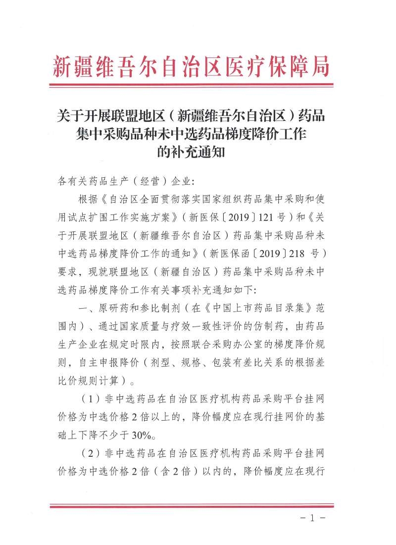 【新疆维吾尔自治区】关于开展联盟地区(新疆维吾尔自治区)药品集中采购品种未中选药品梯度降价工作的补充通知
