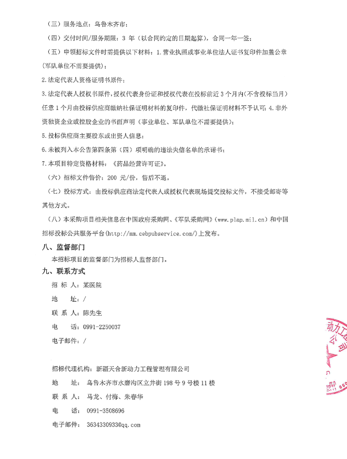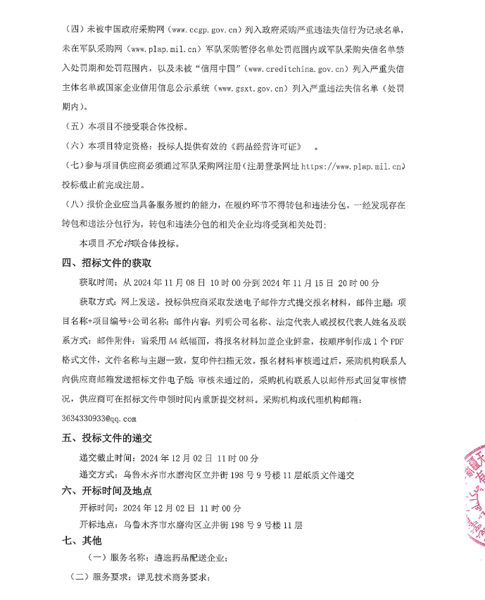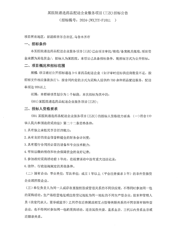 【军队采购】军队某医院遴选药品配送企业服务项目(三次)招标公告