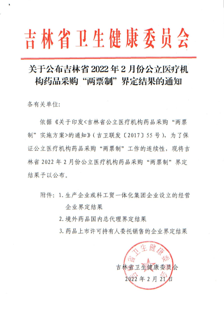 【吉林】关于公布吉林省2022年2月份公立医疗机构药品采购“两票制”界定结果的通知