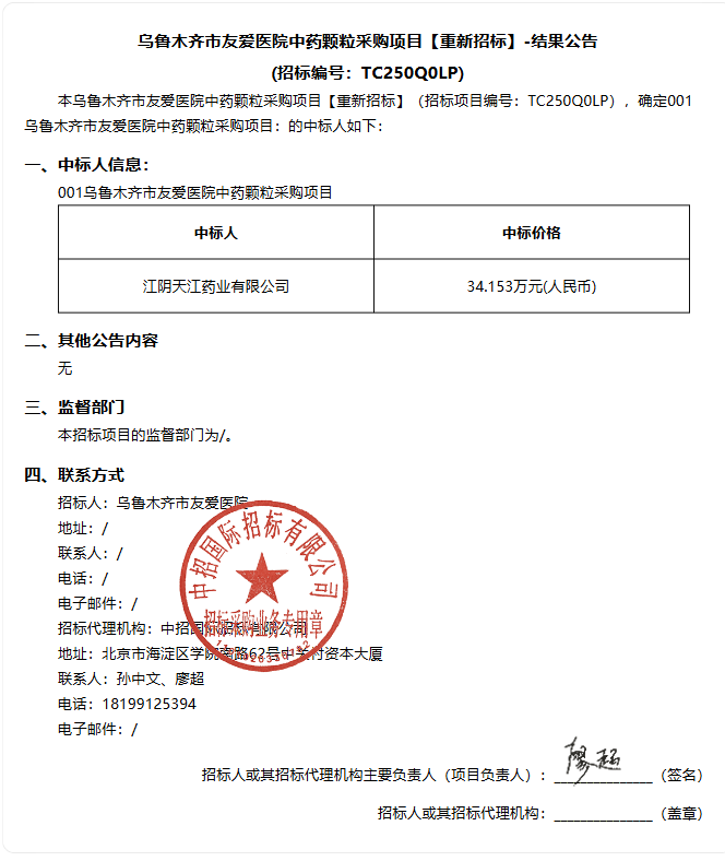 【乌鲁木齐市友爱医院】新疆维吾尔自治区乌鲁木齐市友爱医院中药颗粒采购项目〔重新招标〕-结果公告