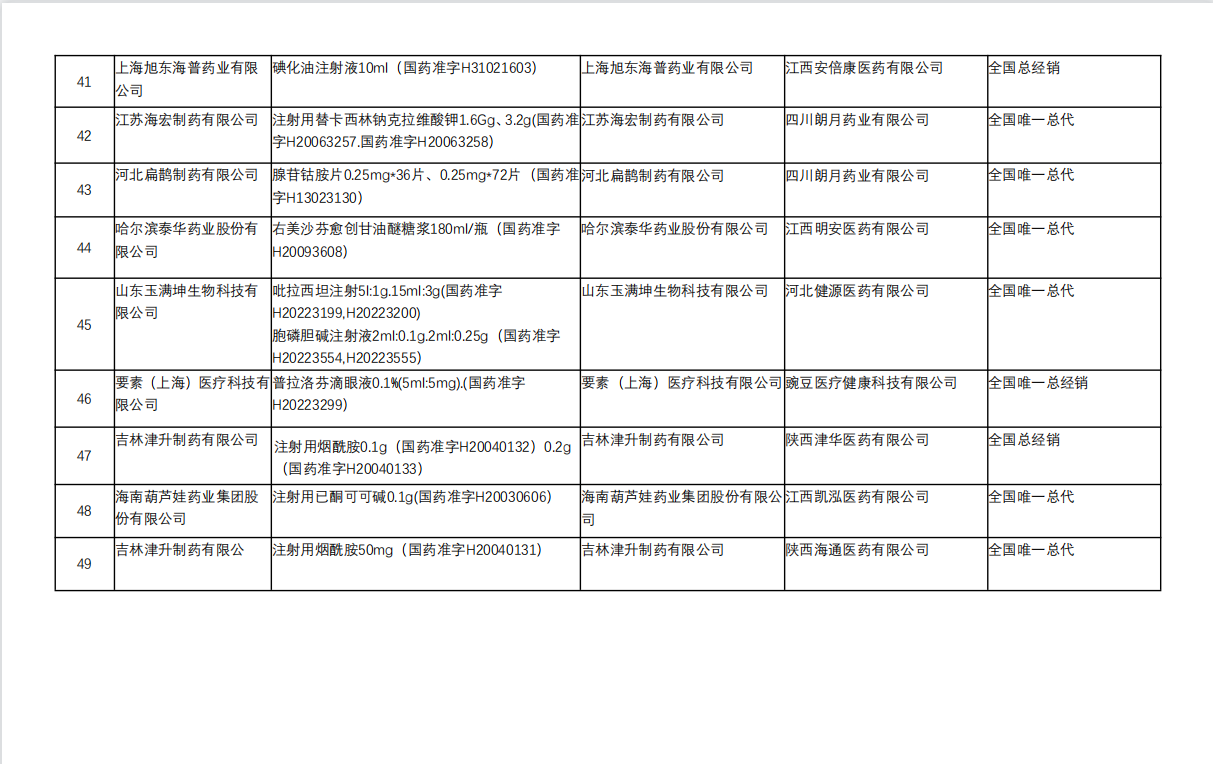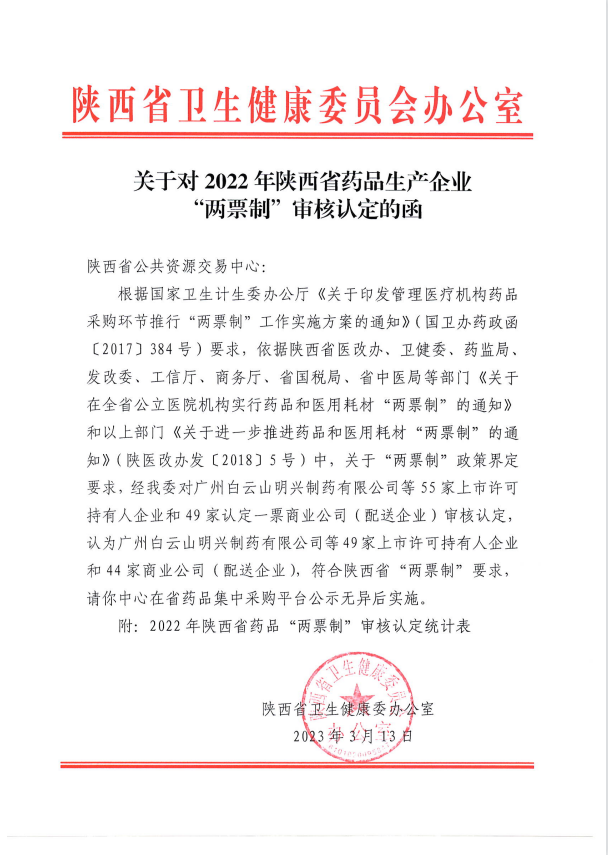 根据国家卫生计生委办公厅《关于印发管理医疗机构药品采购环节推行“两票制”工作实施方案的通知》(国卫办药政函〔2017〕384号)要求,依据陕西省医改办、卫健委、药监局、发改委、工信厅、商务厅、省国税局、省中医局等部门《关于在全省公立医院机构实行药品和医用耗材“两票制”的通知》和以上部门《关于进一步推进药品和医用耗材“两票制”的通知》(陕医改办发〔2018〕5号)中,关于"两票制"政策界定要求,经我委对广州白云山明兴制药有限公司等55家上市许可持有人企业和49家认定一票商业公司(配送企业)审核认定,认为广州白云山明兴制药有限公司等49家上市许可持有人企业和44家商业公司(配送企业),符合陕西省“两票制”要求,请你中心在省药品集中采购平台公示无异后实施。