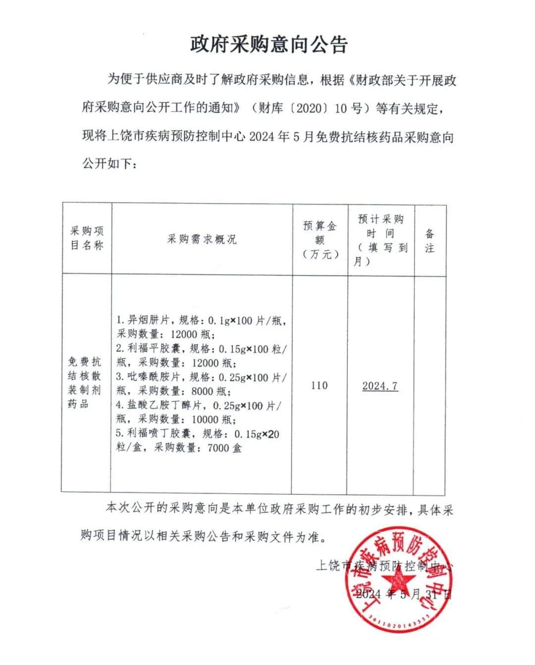 【上饶市疾病预防控制中心】江西省上饶疾控免费抗结核散装制剂药品采购意向公告