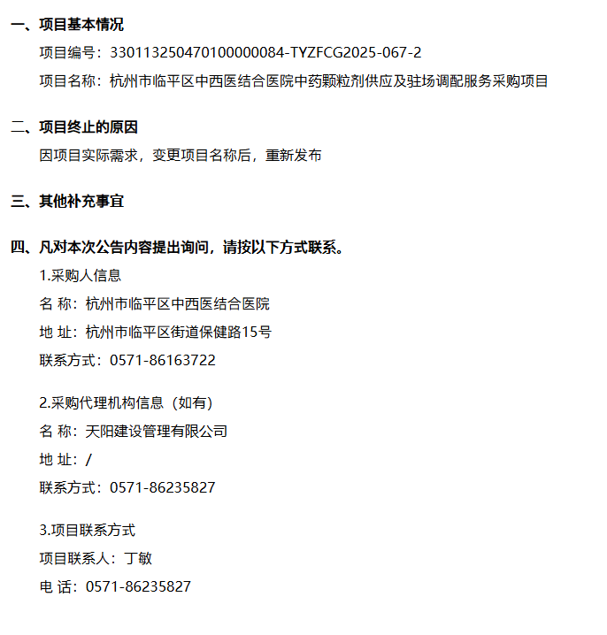 【杭州市临平区中西医结合医院】浙江省杭州市临平区中西医结合医院关于杭州市临平区中西医结合医院中药颗粒剂供应及驻场调配服务采购项目的终止公告