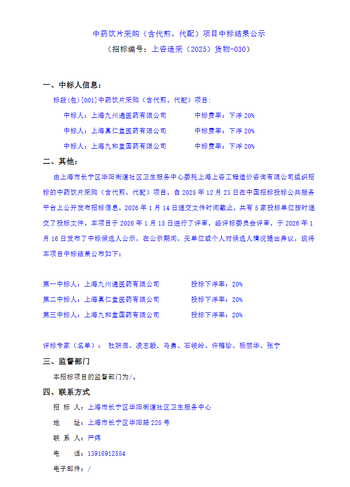【上海市长宁区华阳街道社区卫生服务中心】上海市长宁区华阳街道社区卫生服务中心中药饮片采购(含代煎、代配)项目中标结果公示