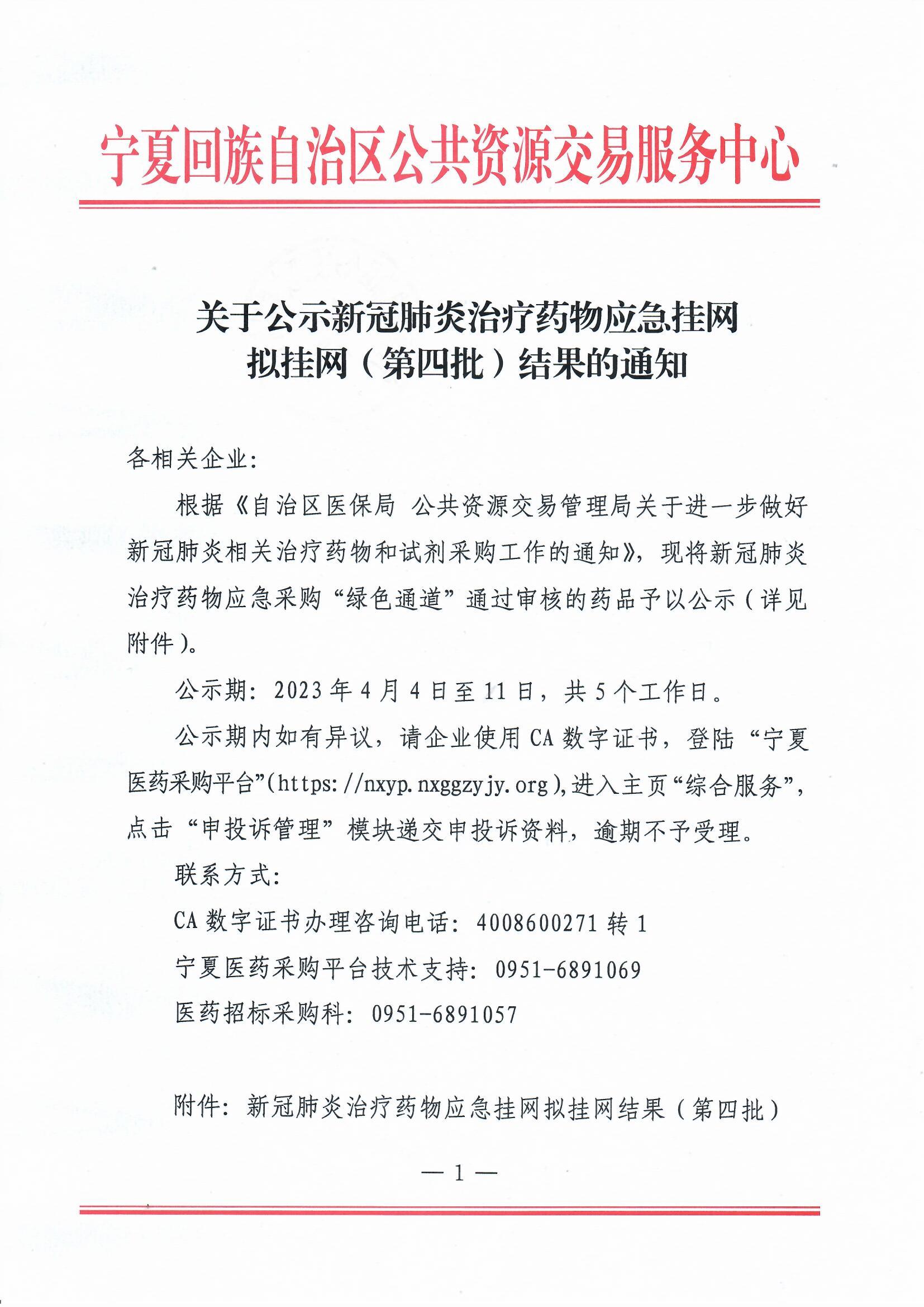 附件:新冠肺炎治疗药物应急挂网拟挂网结果(第四批)
