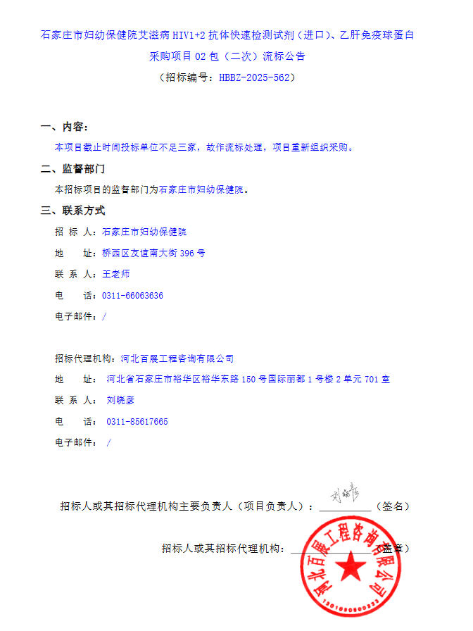 【石家庄市妇幼保健院】河北省石家庄市妇幼保健院艾滋病HIV1+2抗体快速检测试剂(进口)、乙肝免疫球蛋白采购项目02包(二次)流标公告