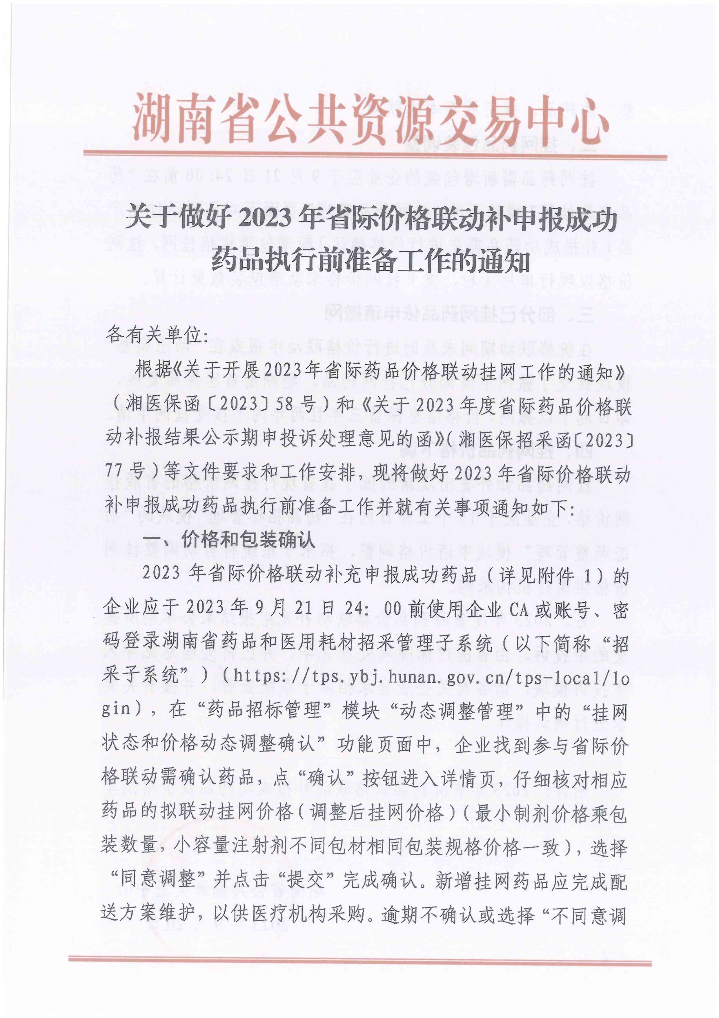 2023年省际价格联动补充申报成功药品(详见附件1)的企业应于2023年9月21日24:00前使用企业CA或账号、密码登录湖南省药品和医用耗材招采管理子系统(以下简称“招采子系统”)(https://tps.ybj.hunan.gov.cn/tps-local/10gin),在"药品招标管理”模块“动态调整管理”中的“挂网状态和价格动态调整确认"功能页面中,企业找到参与省际价格联动需确认药品,点"确认"按钮进入详情页,仔细核对相应药品的拟联动挂网价格(调整后挂网价格)(最小制剂价格乘包装数量,小容量注射剂不同包材相同包装规格价格一致),选择"同意调整"并点击“提交”完成确认。新增挂网药品应完成配送方案维护,以供医疗机构采购。逾期不确认或选择“不同意调整"的药品,视同放弃本次联动。
