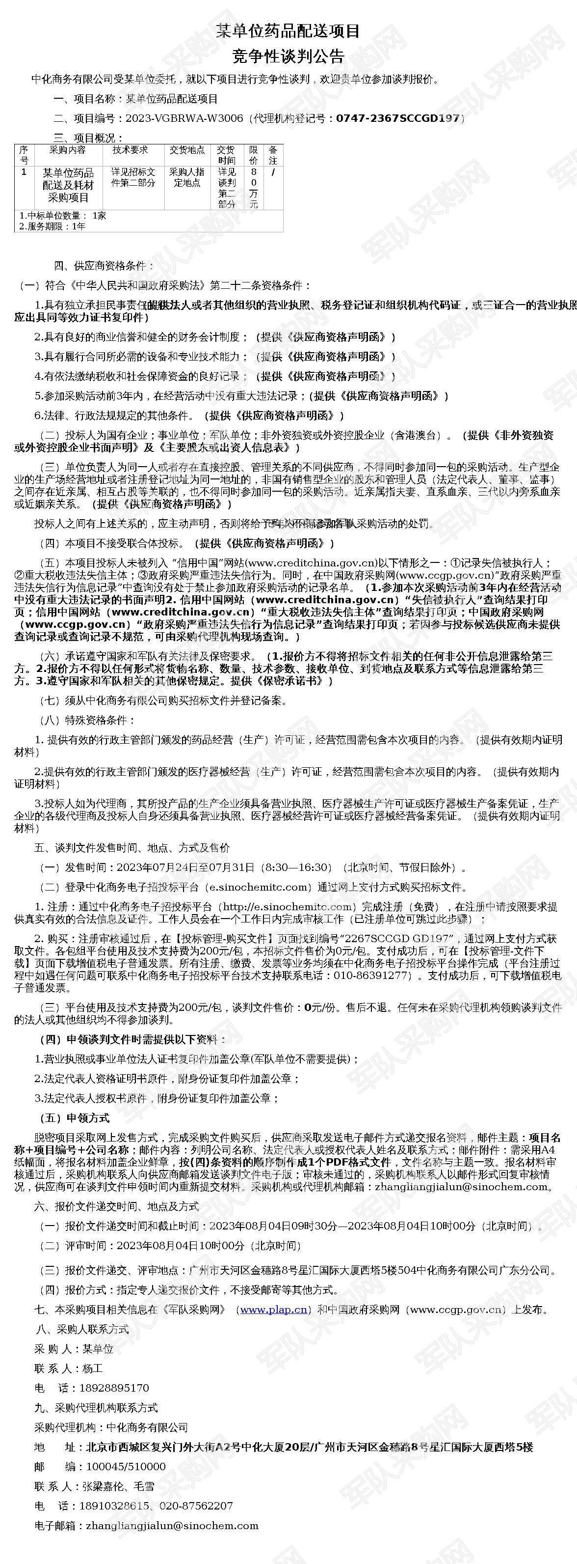 【军队采购】军队采购网某单位药品配送项目竞争性谈判公告(2023-VGBRWA-W3006)