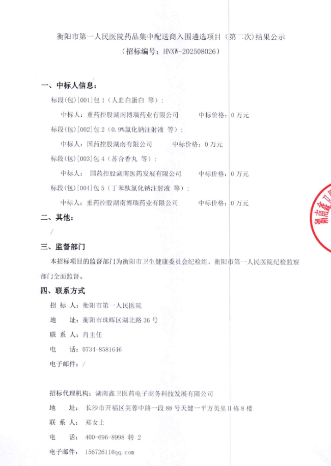 【衡阳市第一人民医院】湖南省衡阳市第一人民医院药品集中配送商入围遴选项目(第二次)结果公示