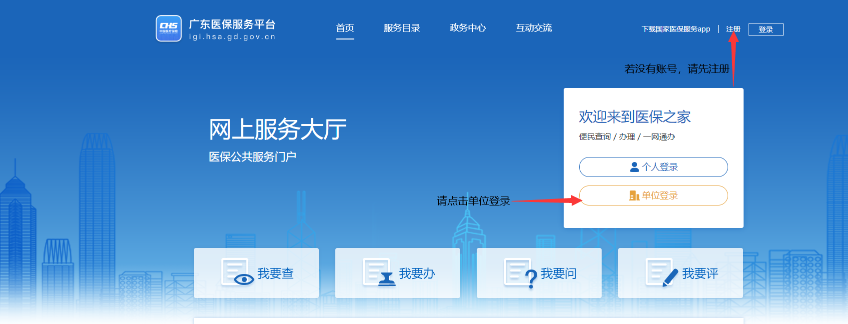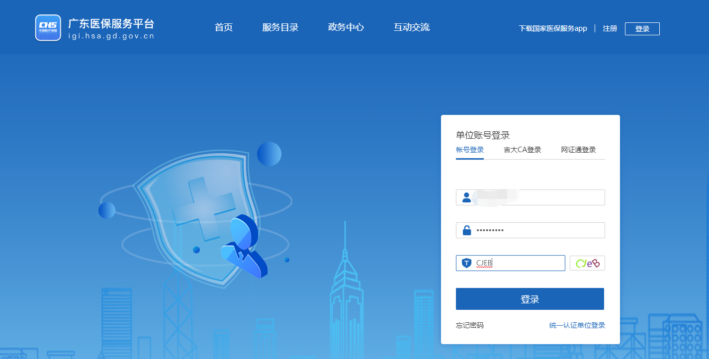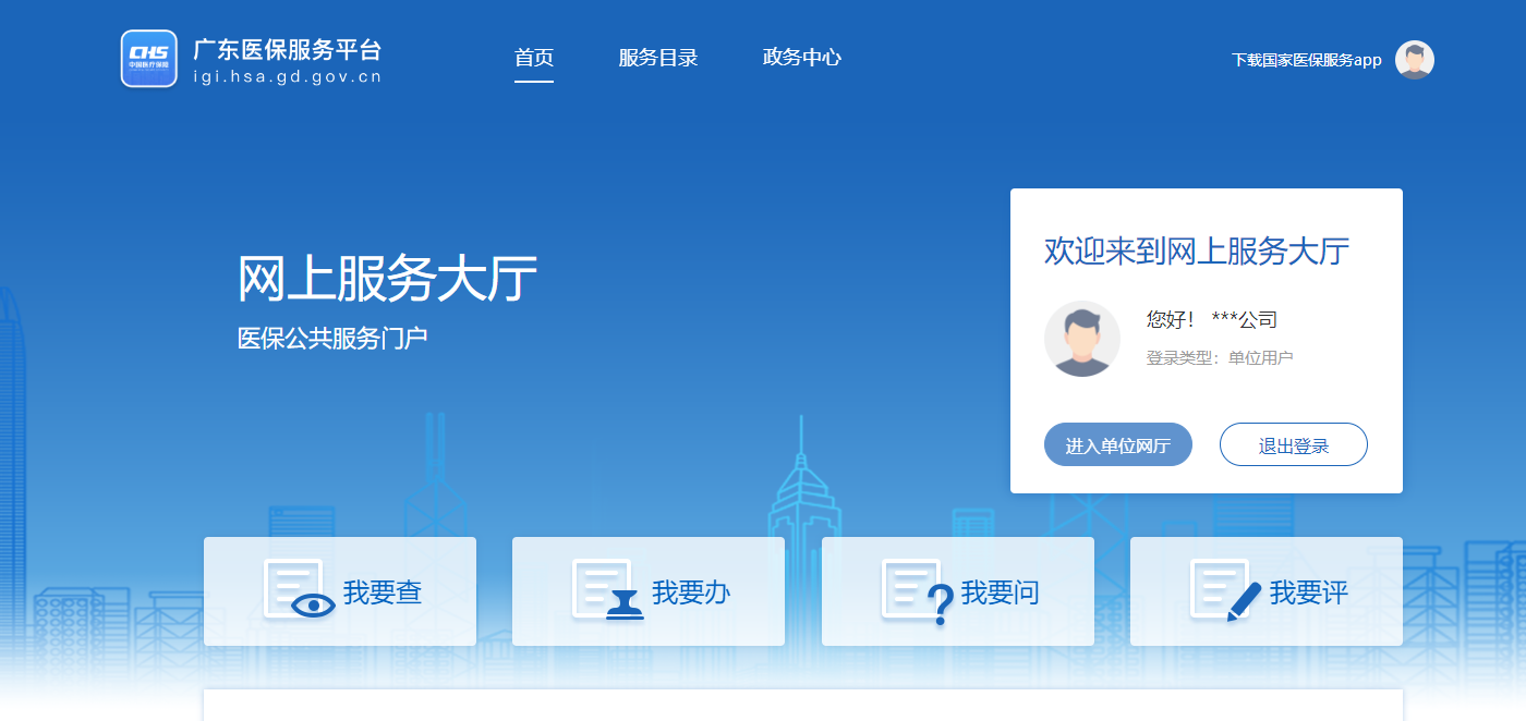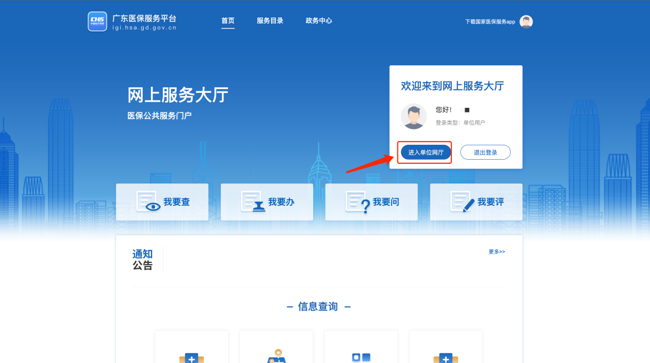 1、访问广东医保服务平台,点击【单位登录】,输入账号密码后点击进入单位网厅https://igi.hsa.gd.gov.cn/ggfw/hsa-local/web/hallEnter/#/Index