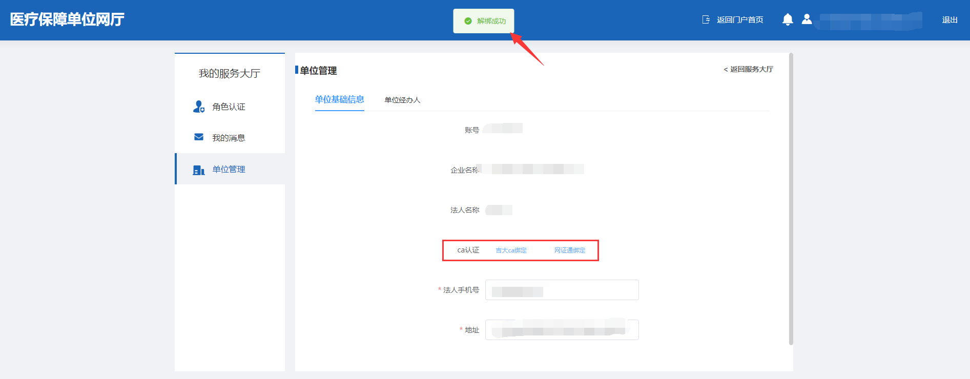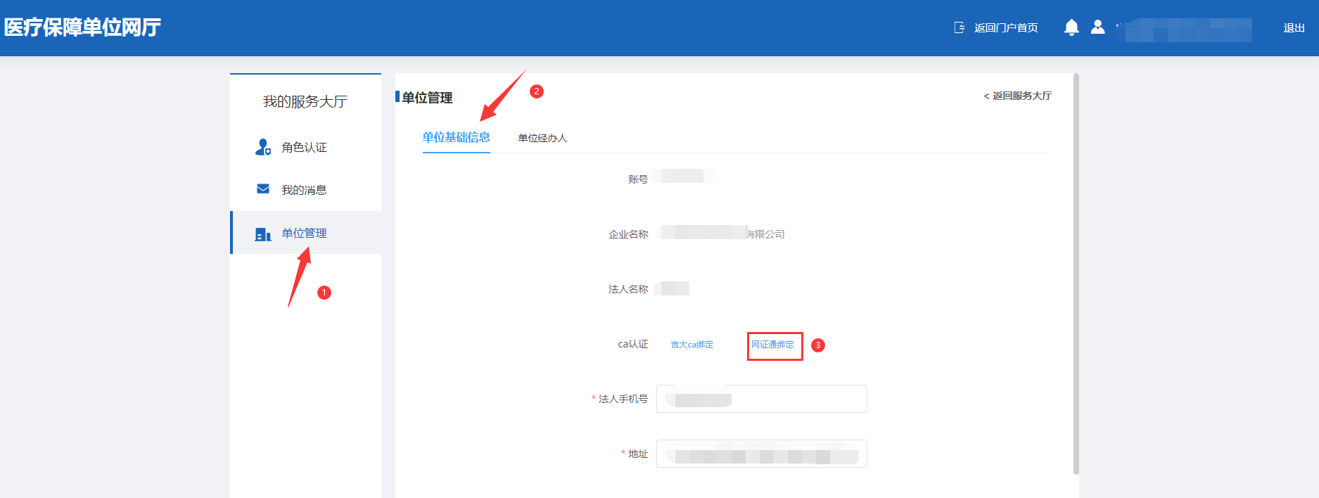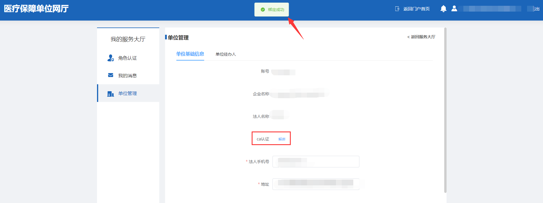 2、请点击【单位管理】—【单位基础信息】—【网证通绑定】,绑定成功如图示。