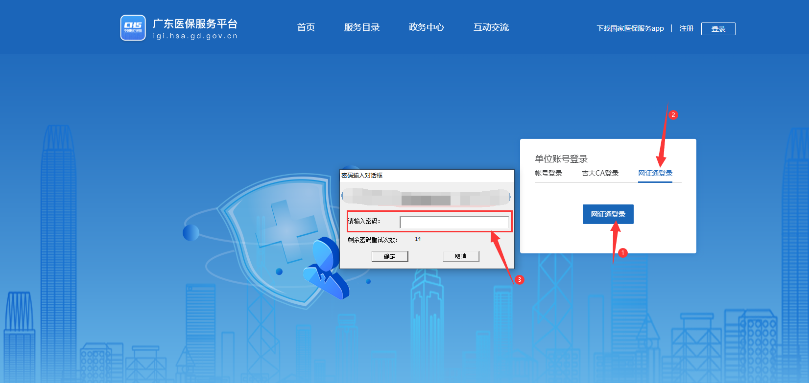 1、插入网证通CA,点击【单位登录】-【网证通登录】,输入CA密码并确定,再点击一次【网证通登录】按钮,即可完成登录。
