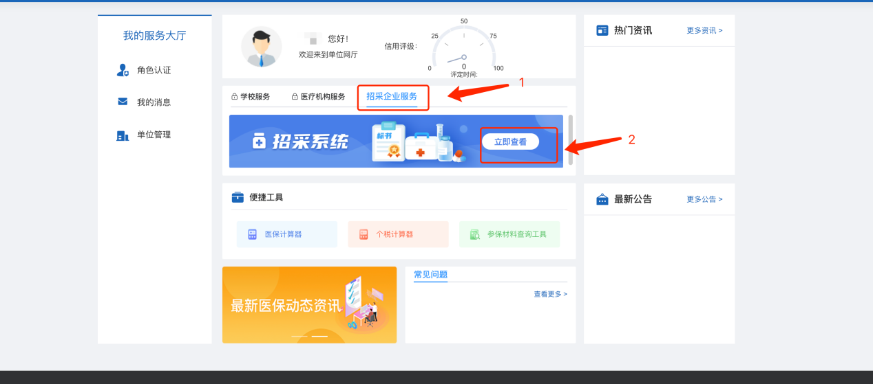 2、请点击【招采企业服务】,点击【立即查看】(注意下面几点)