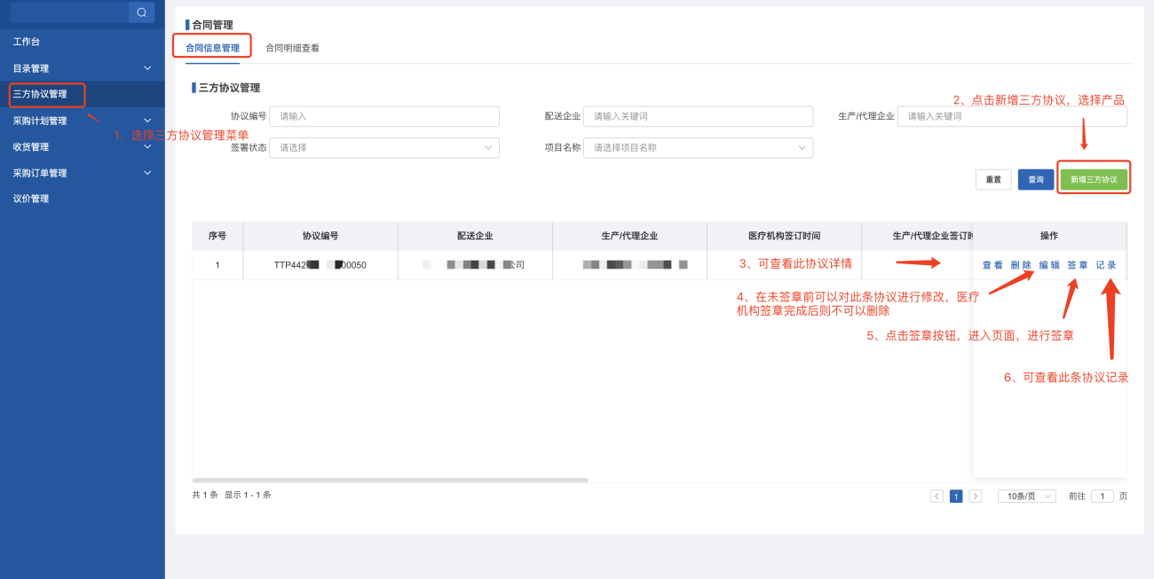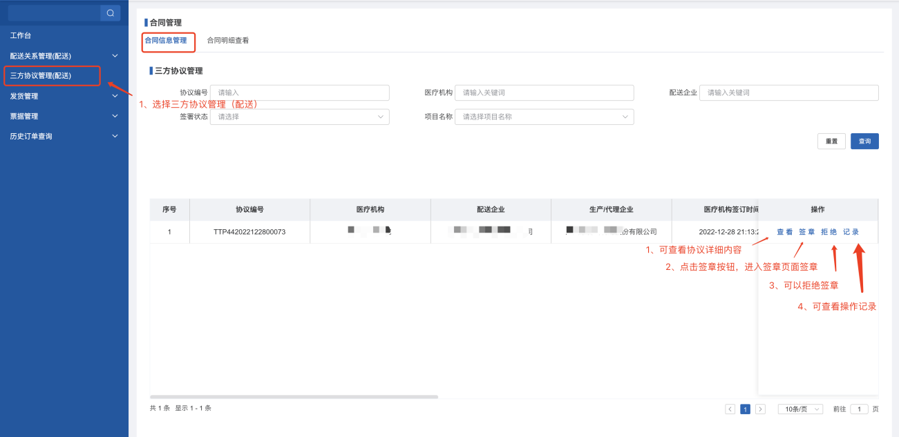 2、配送企业点击【三方协议管理(生产)】菜单下的【合同信息管理】模块响应医疗机构发起的三方协议