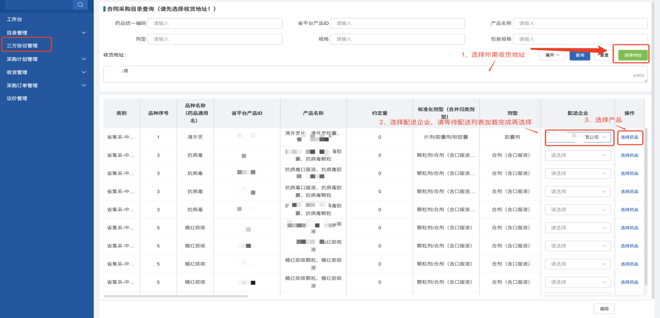 (2)点击【选择药品】按钮进入选择配送企业、收货地址具体操作页面