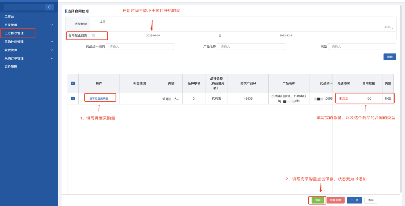 ⑦ 输入月度采购数量,填写补签原因(独家备选的产品),点击保存,最后点击下一步生成三方协议,进入主页面,进行签章。