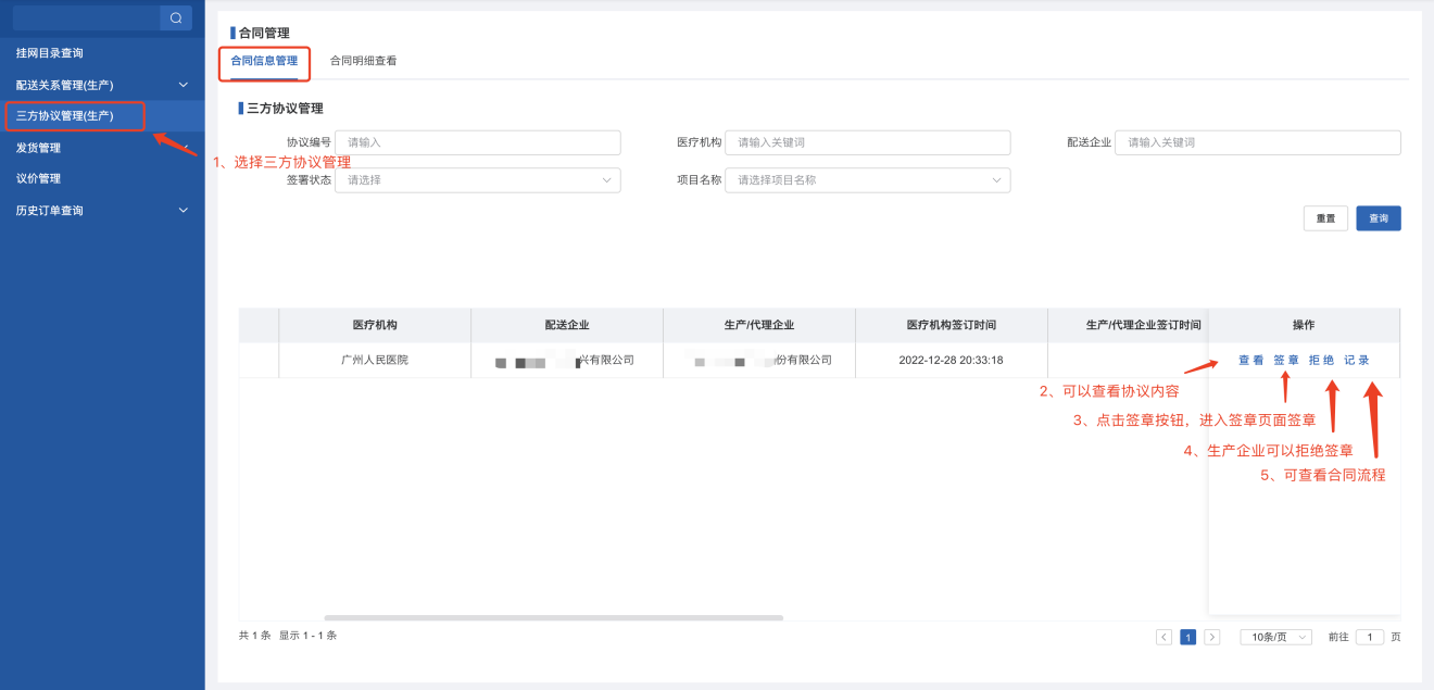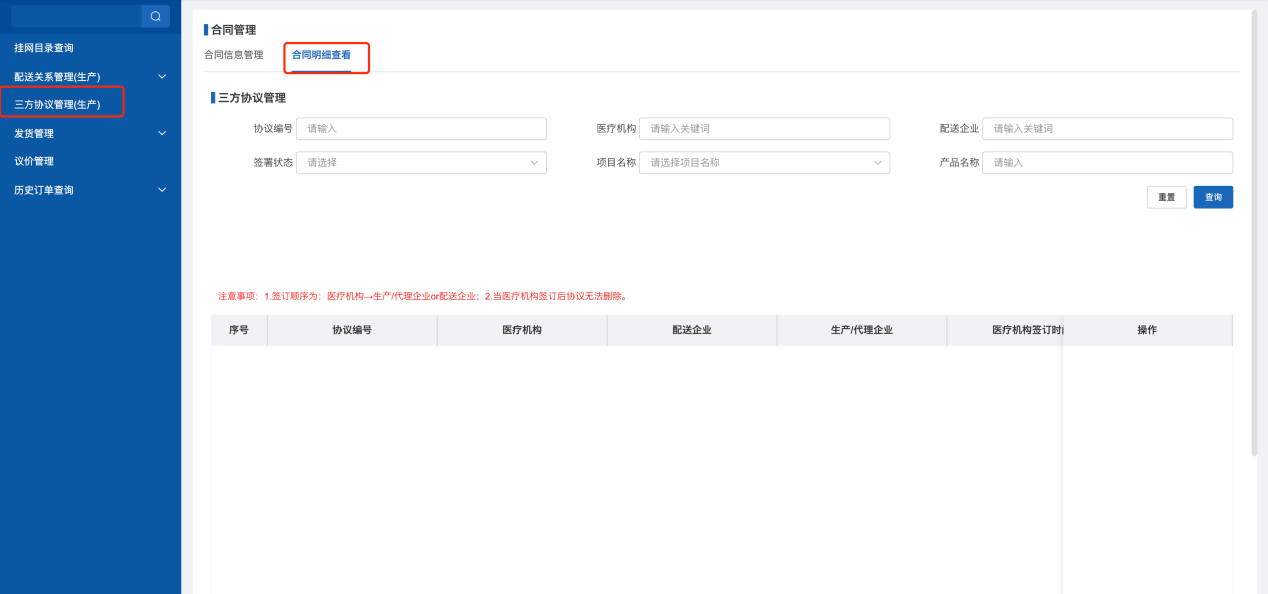 2、生产企业点击【三方协议管理(生产)】菜单下的【合同信息管理】模块响应医疗机构发起的三方协议
