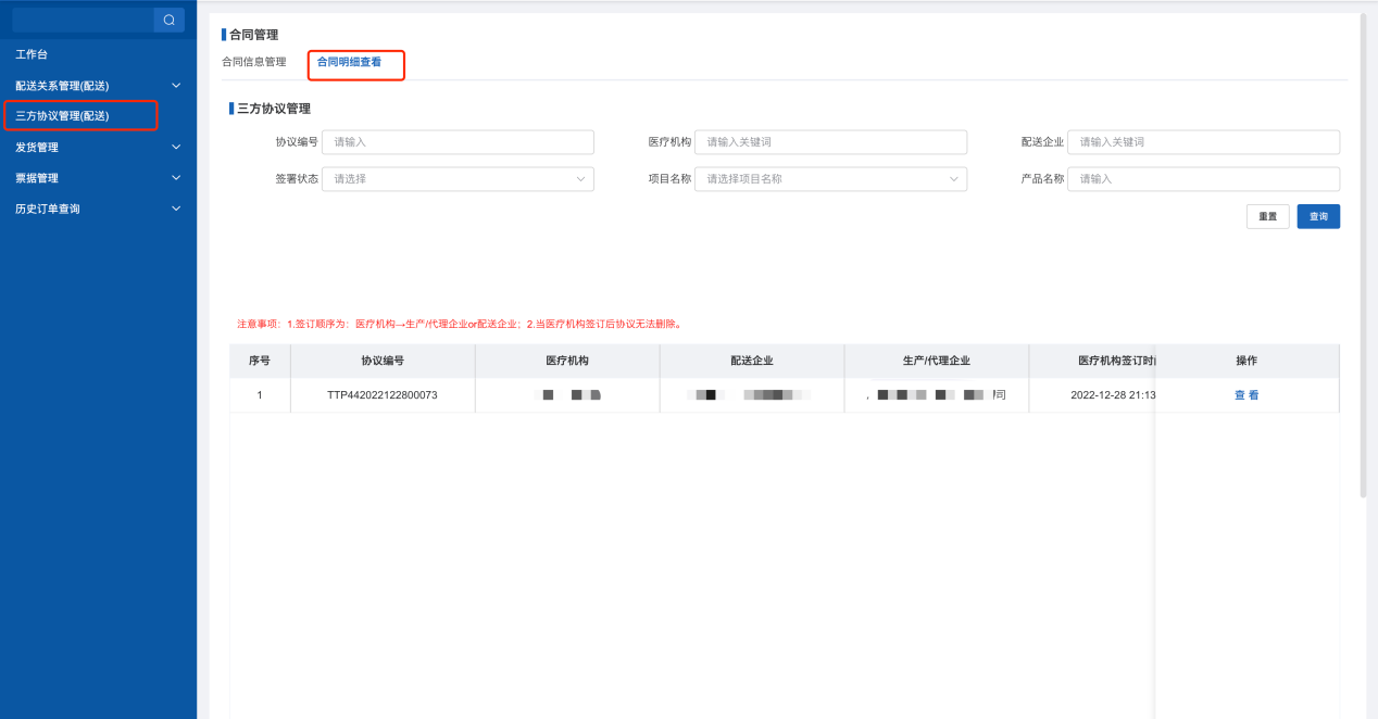 (1)点击【合同明细查看】模块查找历史已签三方协议