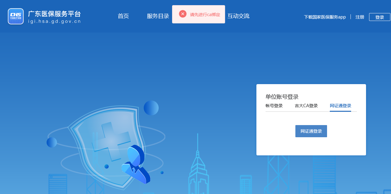 1、使用【账号登录】方式登录,完成CA绑定。https://igi.hsa.gd.gov.cn/ggfw/hsa-local/web/hallEnter/#/Index