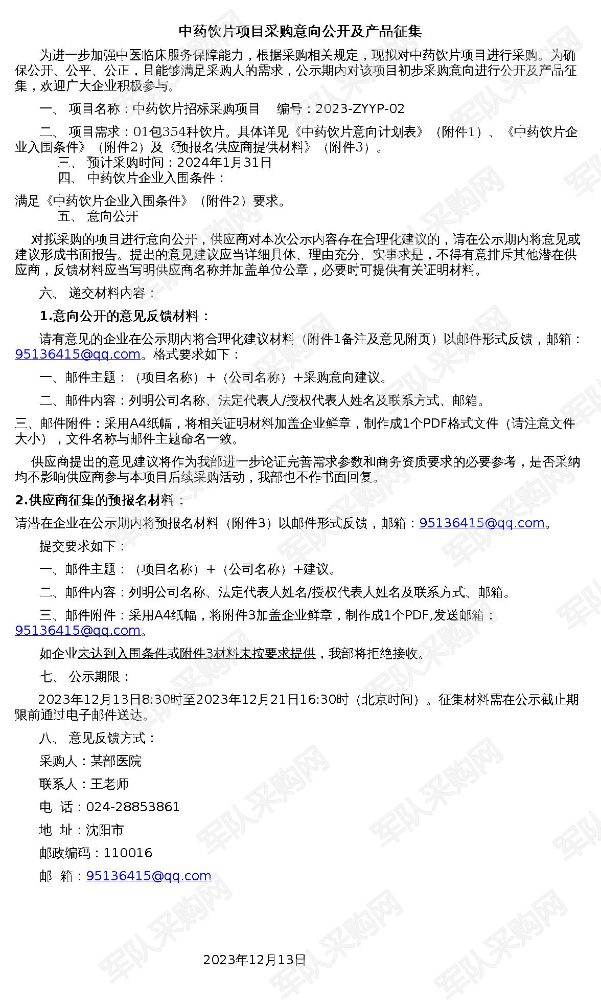 【军队采购】军队采购网中药饮片项目采购意向公开及产品征集2023-ZYYP-02