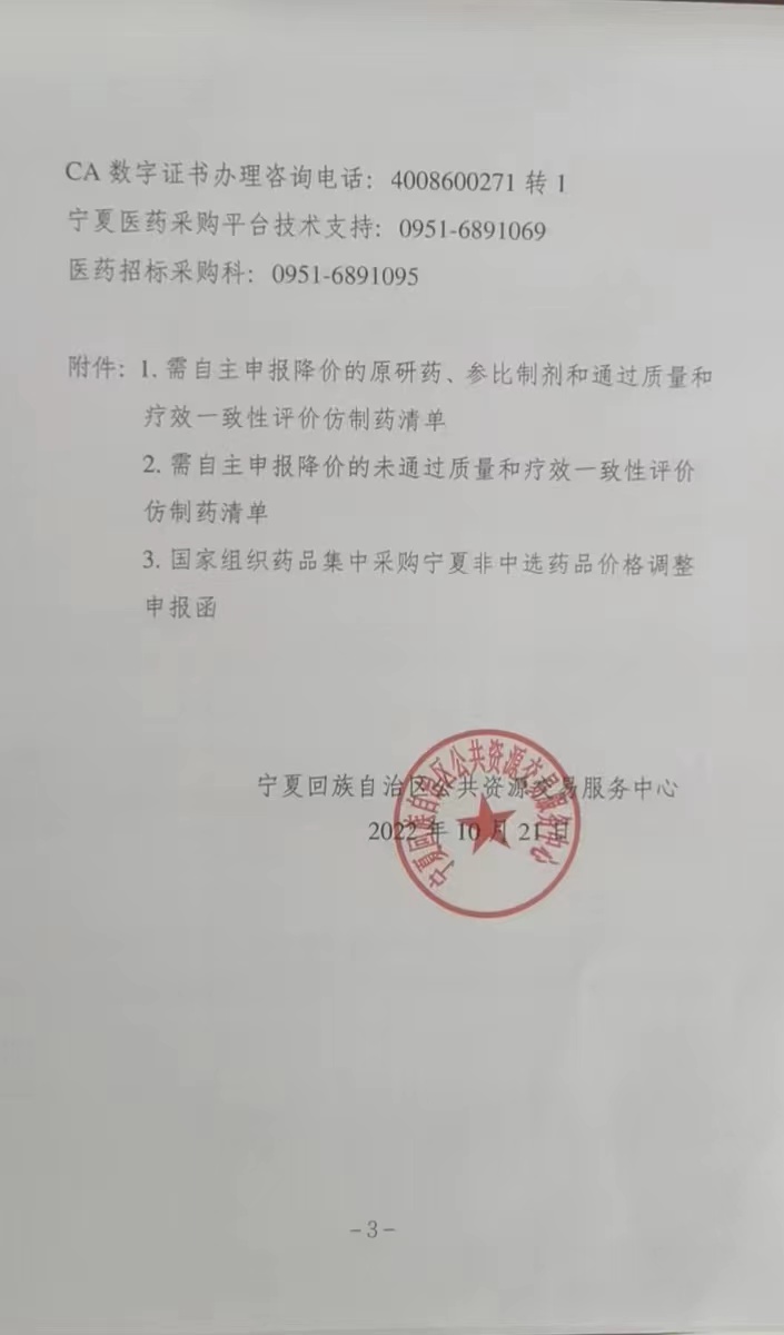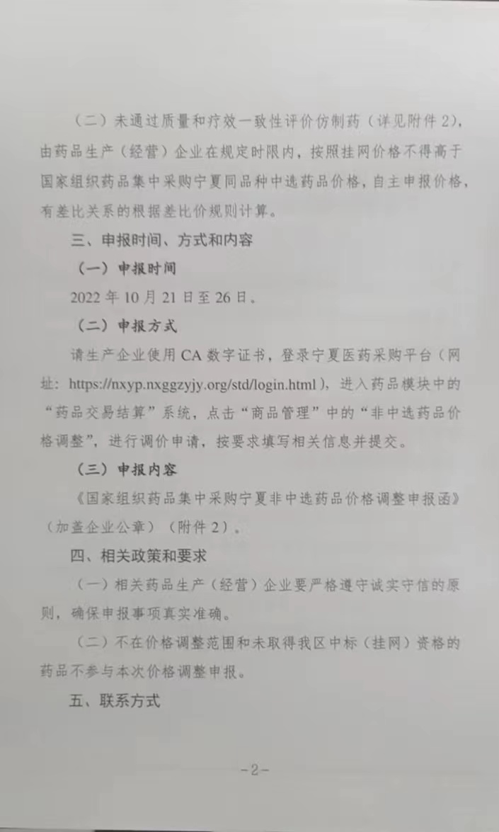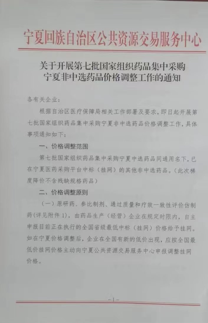 【宁夏】宁夏回族自治区关于开展第七批国家组织药品集中采购宁夏非中选药品价格调整工作的通知