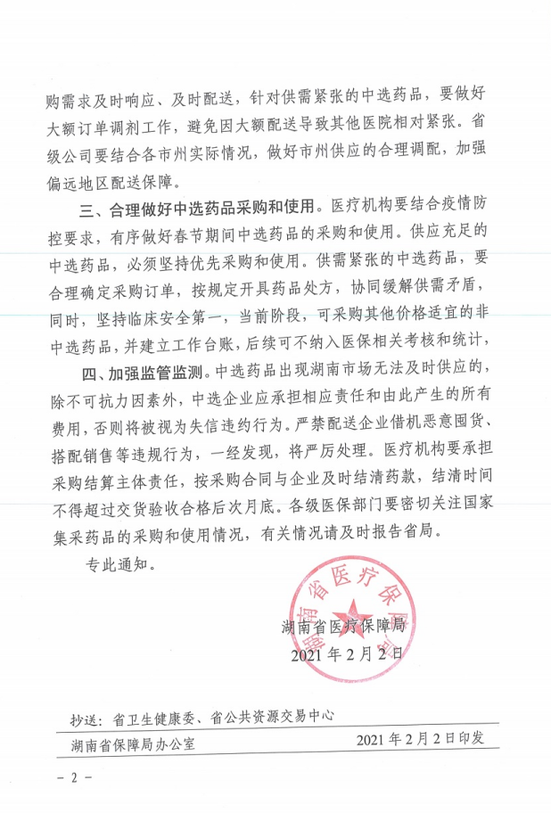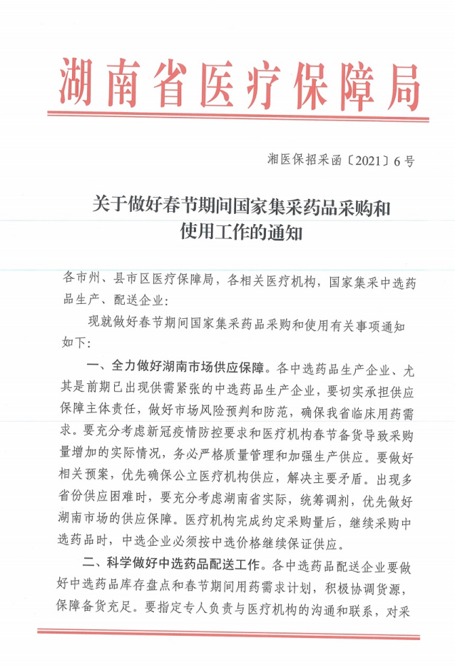 【湖南】2021年湖南省关于做好春节期间国家集采药品采购和使用工作的通知