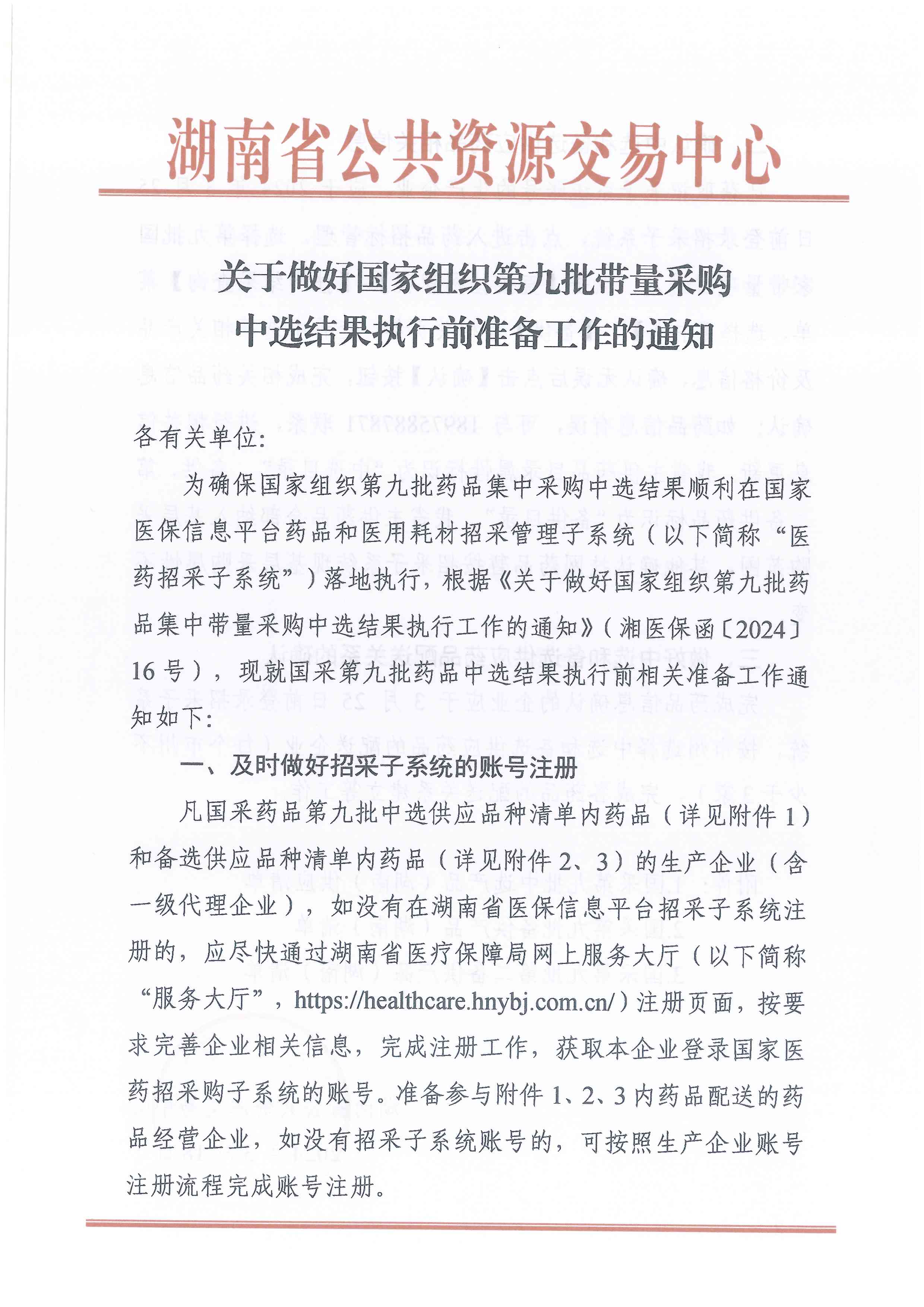 为确保国家组织第九批药品集中采购中选结果顺利在国家医保信息平台药品和医用耗材招采管理子系统(以下简称“医药招采子系统”)落地执行,根据《关于做好国家组织第九批药品集中带量采购中选结果执行工作的通知》(湘医保函〔2024〕16号),现就国采第九批药品中选结果执行前相关准备工作通知如下: