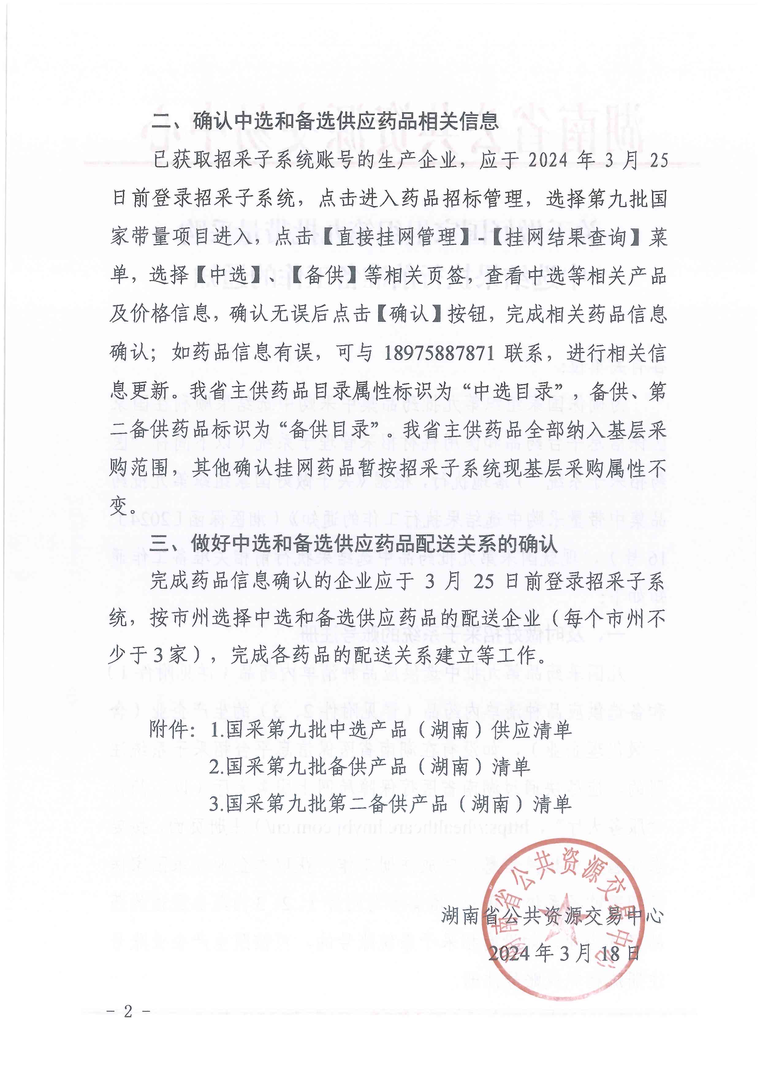 已获取招采子系统账号的生产企业,应于2024年3月25日前登录招采子系统,点击进入药品招标管理,选择第九批国家带量项目进入,点击【直接挂网管理】-【挂网结果查询】菜单,选择【中选】、【备供】等相关页签,查看中选等相关产品及价格信息,确认无误后点击【确认】按钮,完成相关药品信息确认;如药品信息有误,可与18975887871联系,进行相关信息更新。我省主供药品目录属性标识为“中选目录”,备供、第二备供药品标识为“备供目录”。我省主供药品全部纳入基层采购范围,其他确认挂网药品暂按招采子系统现基层采购属性不变。