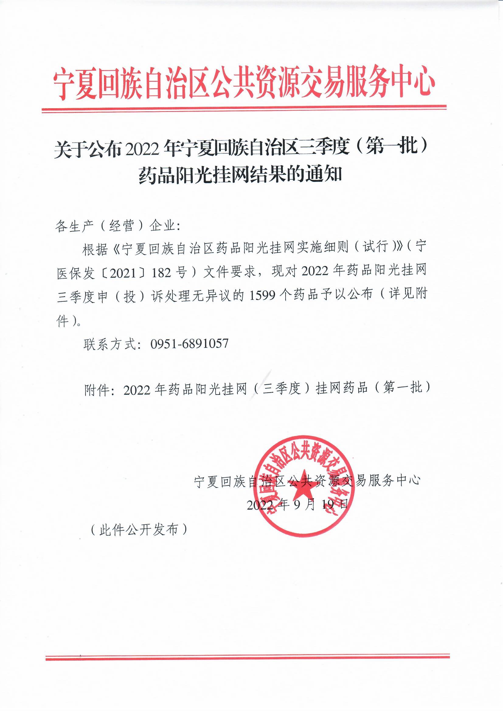 【宁夏】关于公布2022年宁夏回族自治区三季度(第一批)药品阳光挂网结果的通知