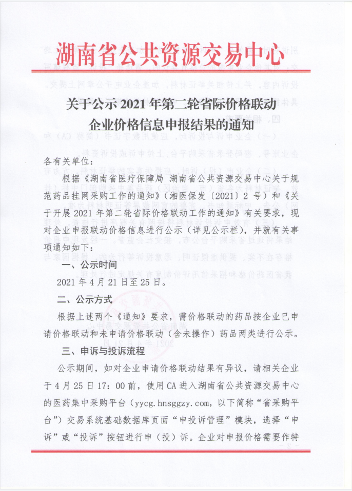 【湖南】2021年湖南省关于公示2021年第二轮省际价格联动企业价格信息申报结果的通知