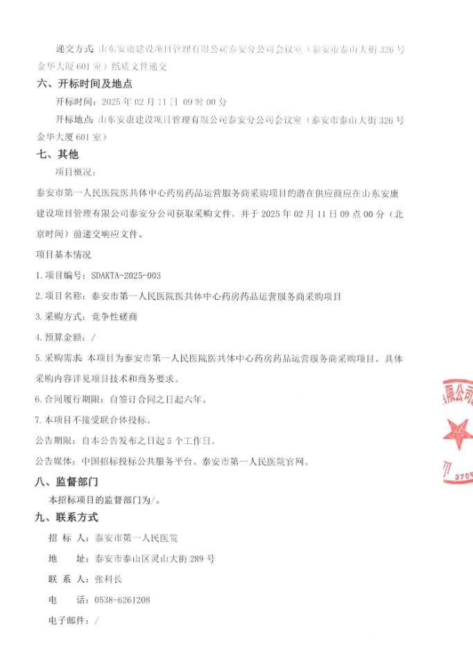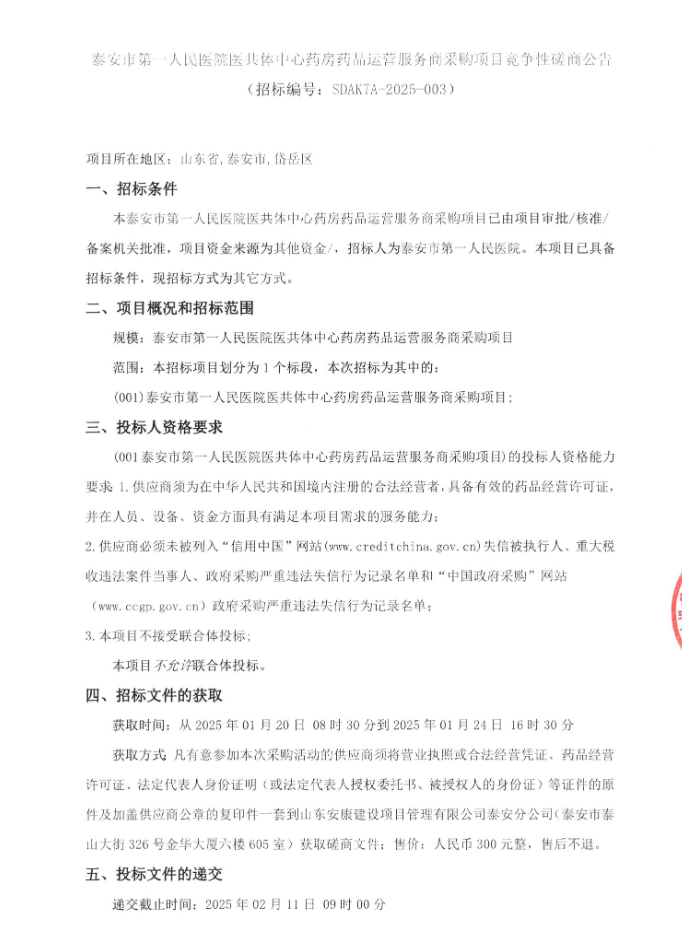 【泰安市第一人民医院】山东省泰安市第一人民医院医共体中心药房药品运营服务商采购项目竞争性磋商公告
