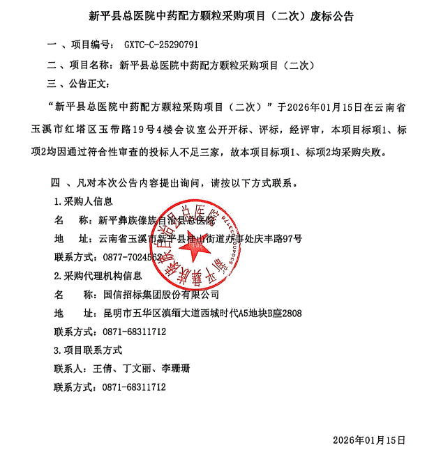 【玉溪市新平县总医院】云南省玉溪市新平县总医院中药配方颗粒采购项目(二次)废标公告
