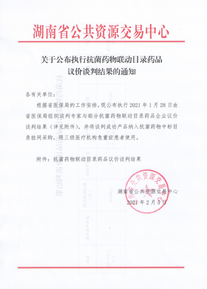 【湖南】2021年湖南省关于公布执行抗菌药物联动目录药品议价谈判结果的通知