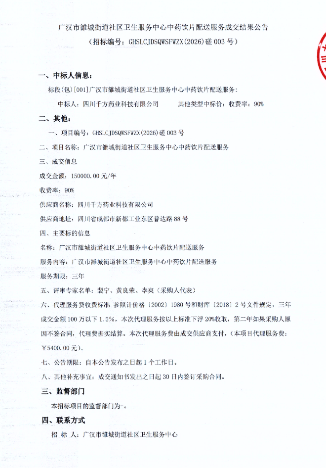 【德阳市广汉市雒城街道社区卫生服务中心】四川省广汉市雒城街道社区卫生服务中心中药饮片配送服务成交结果公告