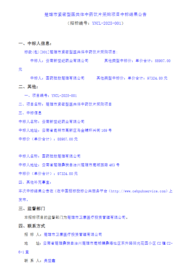 【楚雄彝族自治州楚雄市紧密型医共体】云南省楚雄彝族自治州楚雄市紧密型医共体中药饮片采购项目中标结果公告