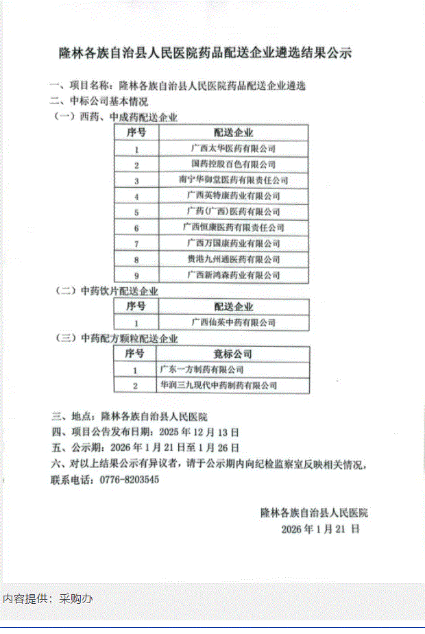 【百色市隆林各族自治县人民医院】广西壮族自治区百色市隆林各族自治县人民医院药品配送企业遴选结果公示
