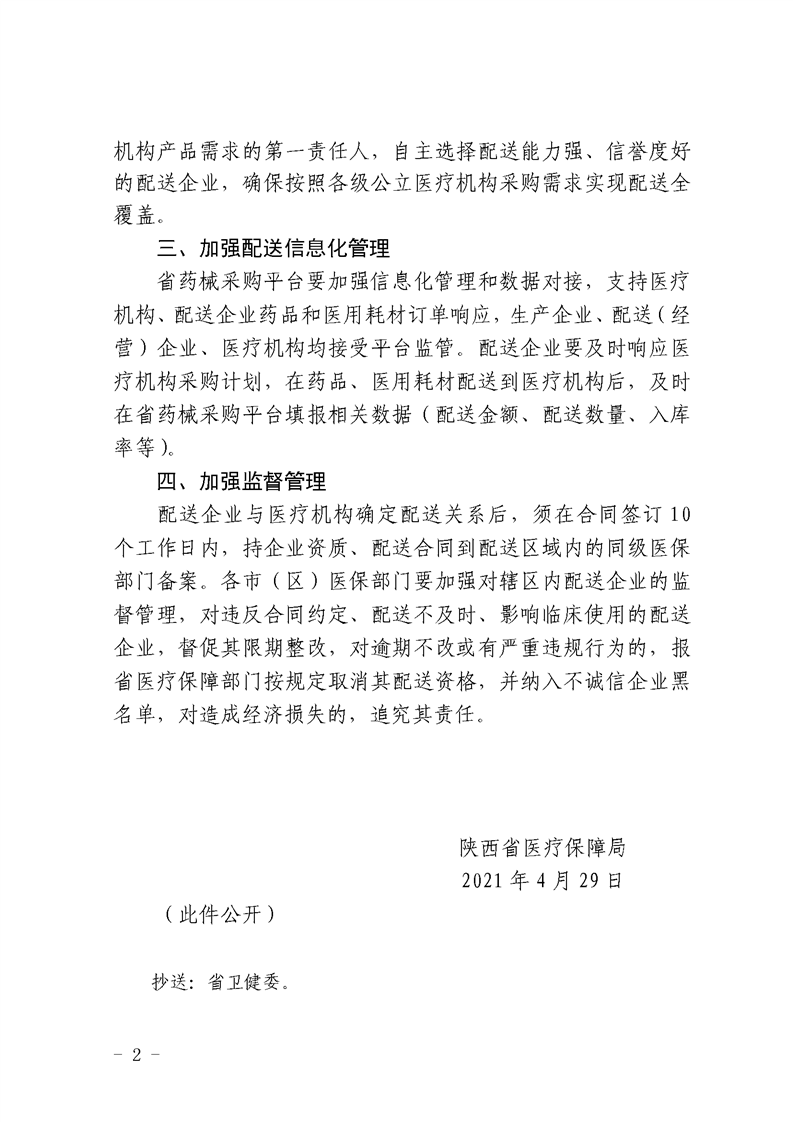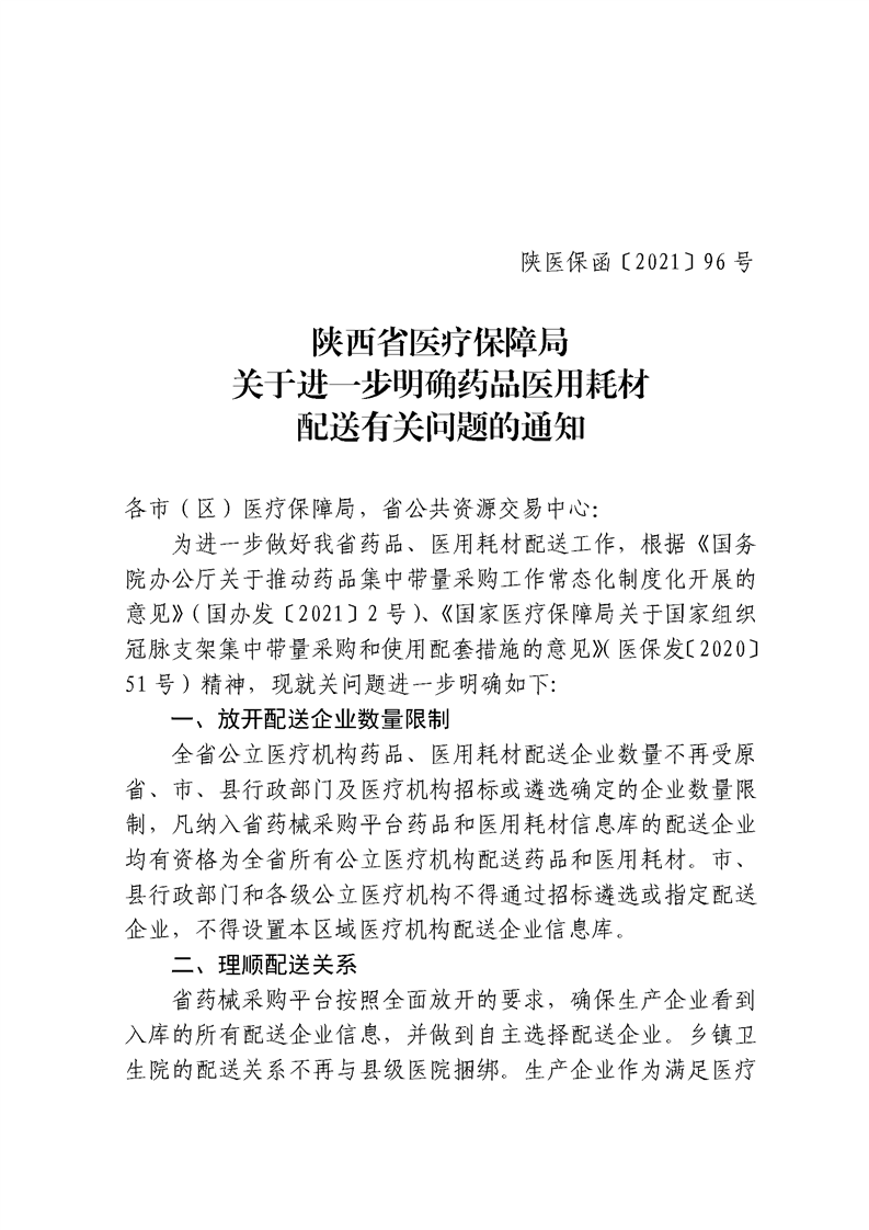 【陕西】2021年陕西省医疗保障局关于进一步明确药品医用耗材配送有关问题的通知 陕医保函〔2021〕96 号