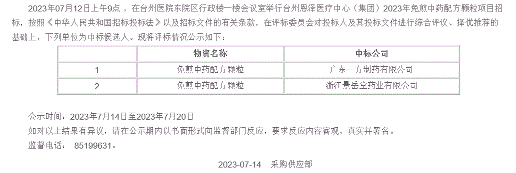 【台州医院】浙江省台州恩泽医疗中心(集团)2023年免煎中药配方颗粒项目预中标公示2023-7-14