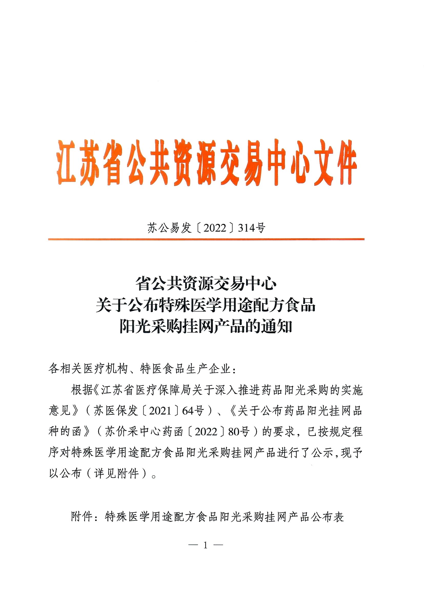 【江苏】省公共资源交易中心关于公布特殊医学用途配方食品阳光采购挂网产品的通知
