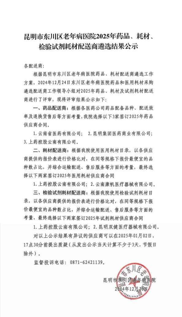 【昆明市东川区老年病医院】云南省昆明市东川区老年病医院2025年药品、耗材、检验试剂耗材配送商遴选结果公示