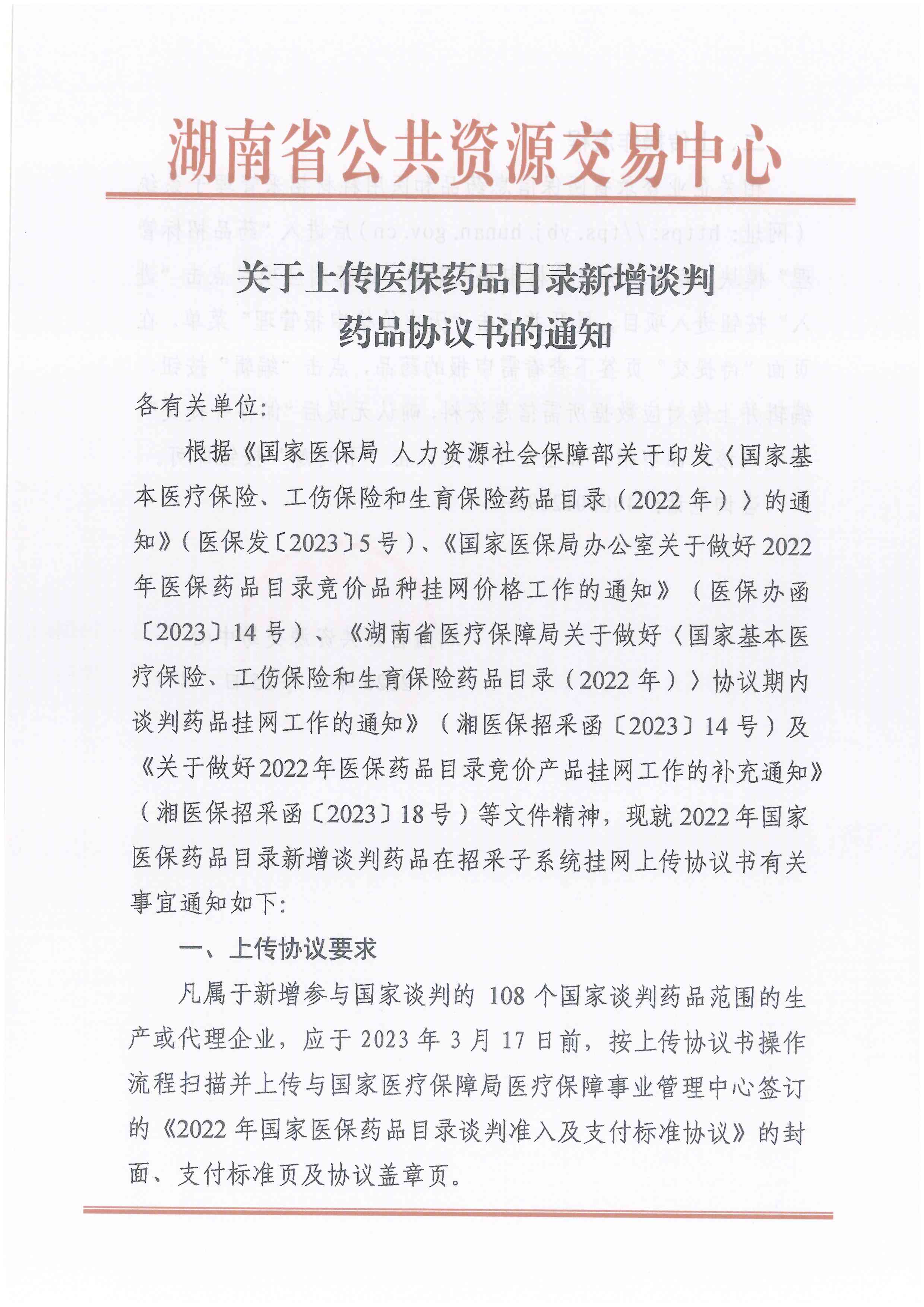 根据《国家医保局 人力资源社会保障部关于印发〈国家基本医疗保险、工伤保险和生育保险药品目录(2022年)》的通知》(医保发〔2023〕5号)、《国家医保局办公室关于做好2022 年医保药品目录竞价品种挂网价格工作的通知》(医保办函〔2023〕14号)、《湖南省医疗保障局关于做好〈国家基本医疗保险、工伤保险和生育保险药品目录(2022年))协议期内谈判药品挂网工作的通知》(湘医保招采函〔2023〕14号)及《关于做好2022年医保药品目录竞价产品挂网工作的补充通知》(湘医保招采函〔2023〕18号)等文件精神,现就2022年国家医保药品目录新增谈判药品在招采子系统挂网上传协议书有关事宜通知如下: