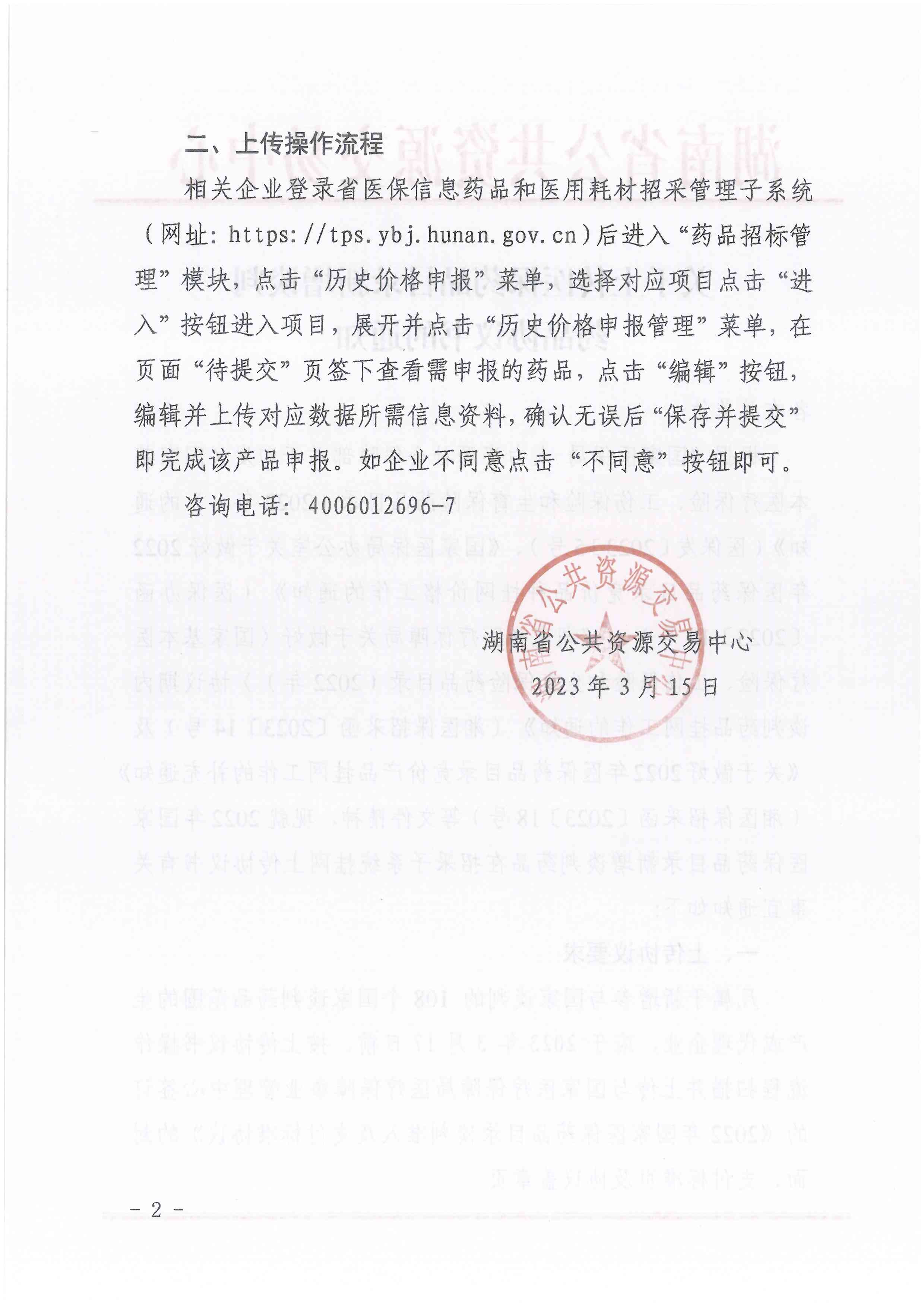 相关企业登录省医保信息药品和医用耗材招采管理子系统(网址:https://tps.ybj.hunan.gov.cn)后进入"药品招标管理”模块,点击“历史价格申报”菜单,选择对应项目点击“进入"按钮进入项目,展开并点击"历史价格申报管理"菜单,在页面“待提交”页签下查看需申报的药品,点击“编辑”按钮,编辑并上传对应数据所需信息资料,确认无误后“保存并提交”即完成该产品申报。如企业不同意点击“不同意”按钮即可。