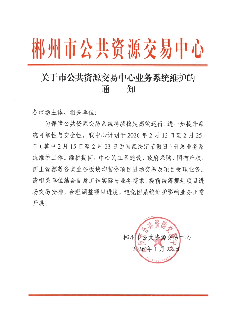 【郴州】关于市公共资源交易中心业务系统维护的通知