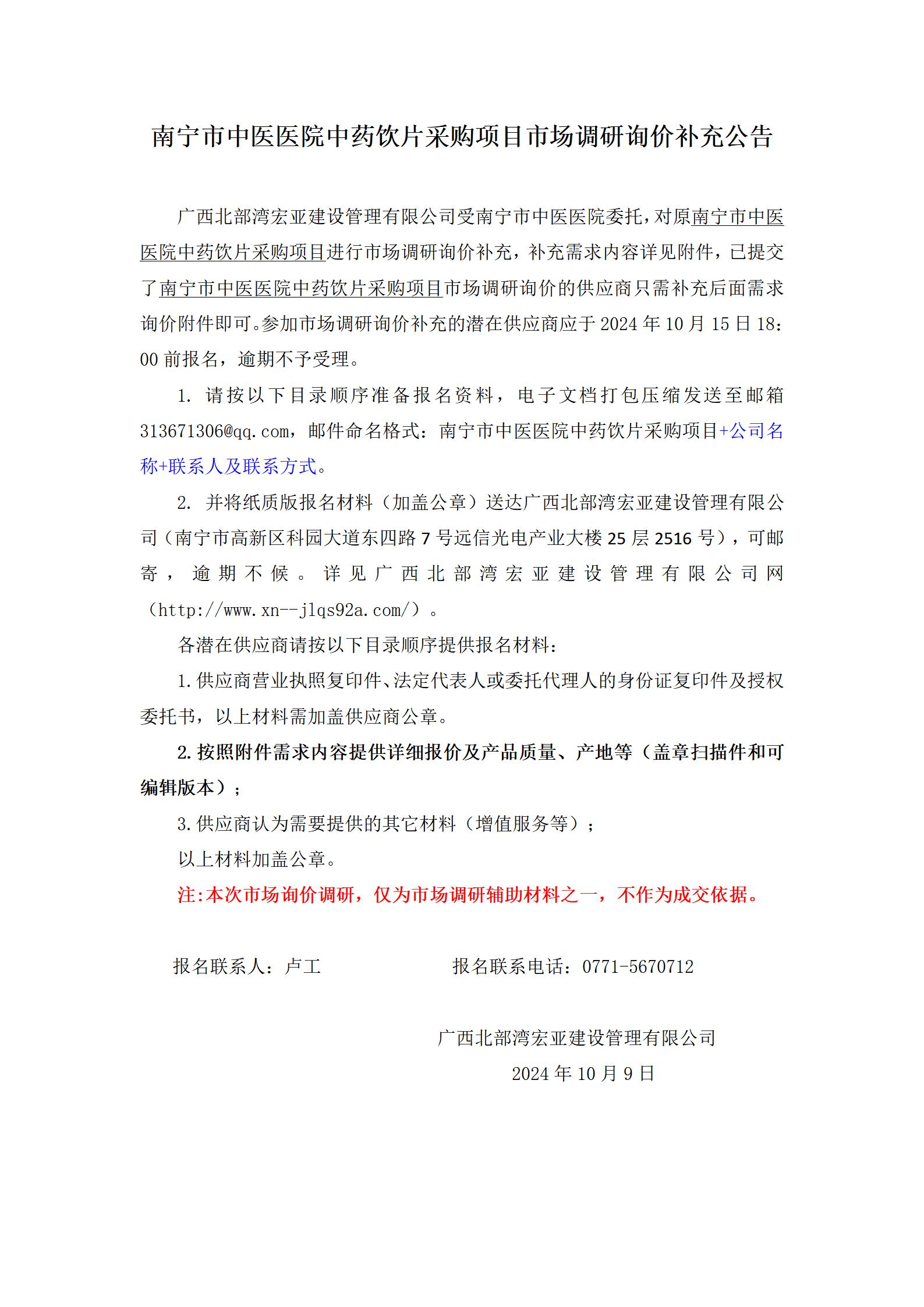 【南宁市中医医院】广西壮族自治区南宁市中医医院中药饮片采购项目市场调研询价补充公告