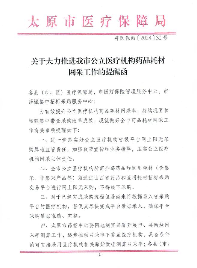 【太原】山西省太原市医疗保障局关于大力推进我市公立医疗机构药品耗材网采工作的提醒函